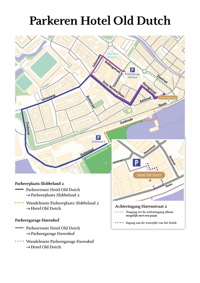 Hotel Old Dutch is gelegen aan de Volendamse haven. De haven is per auto niet bereikbaar na 11.00 uur ’s morgens. Wij adviseren u te parkeren op het recreatiegebied SLOBBELAND/HAVEN ZUID of op het langparkeer gedeelte bij het Marinapark. U vindt ons op 5-7 minuten loopafstand.